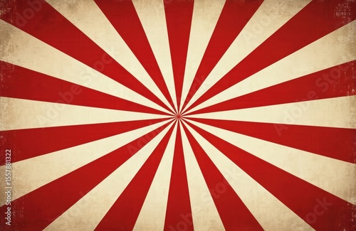 Retro circus poster background. Red, white burst radial lines with grunge texture. Vintage carnival, summer fair or chapiteau backdrop. Nostalgic striped design for entertainment poster or wallpaper.
