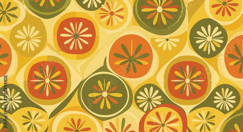 Retro citrus fruit slices pattern on a warm yellow background, vintage mid-century modern aesthetic
