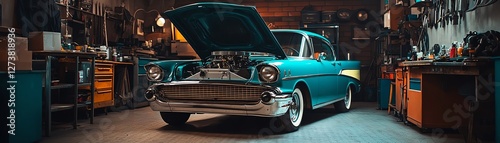 Retro classic car with open hood, engine exposed under soft dim light, vintage mechanic tools, atmospheric garage setting