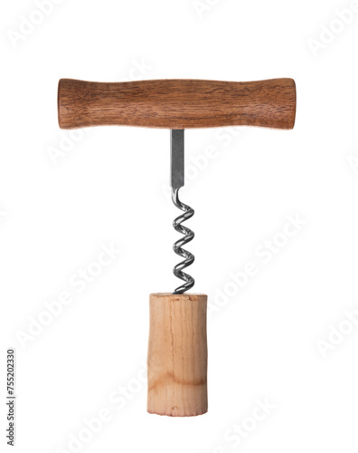 Retro corkscrew opener with cork screwed in on a white insulated background.