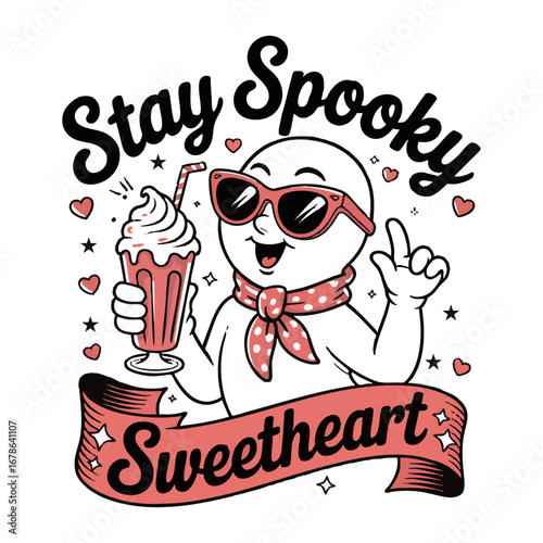 Retro Cute Spooky Ghost Drinking Milkshake Typography Vector Illustration Stay Spooky Sweetheart T-shirt Design, easily editable and scalble.