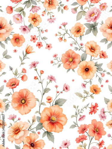 pattern, floral, flower, seamless, wallpaper, white, orange, red, pink, green, leaf, blossom, print, design, spring, illustration, decorative, art, nature, motif, ornament, vintage, retro, botanical, textile, fabric, wrapping, paper, invitation, card, painting, hand-drawn, beautiful, garden, meadow, field, blooming, colourful, vector, texture, decor, template, background, plant, tree branch, foliage, cover, wall