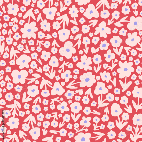 Retro flowers with leaves seamless repeat pattern. Hand drawn, random placed, vector florals all over surface print on pink background.