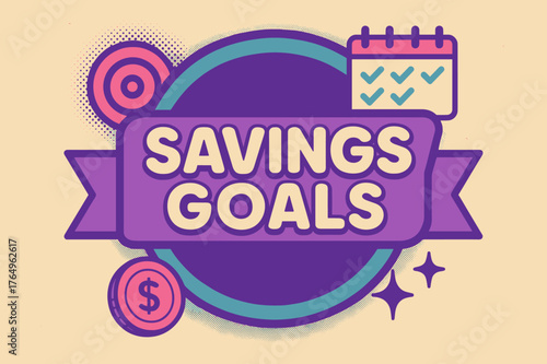 Retro Savings Poster. Savings Goals ? Retro Poster; lettering: bold rounded; composition: ribboned seal with side icons; effects: halftone rim + gentle shadow;