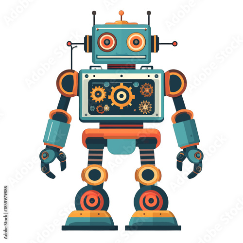 robot, retro, vintage, mechanical, gear, clockwork, futuristic, android, automaton, cyborg, artificial intelligence, ai, technology, science fiction, science fiction, character, toy, electronic, digital, machine, design, illustration, graphic, art, concept, creature, robotic, automation, future, nostalgia, childhood, playful, cute, friendly, blue, orange, teal, white background, isolated, full body, standing, creativity, innovation, construction, assembly, work