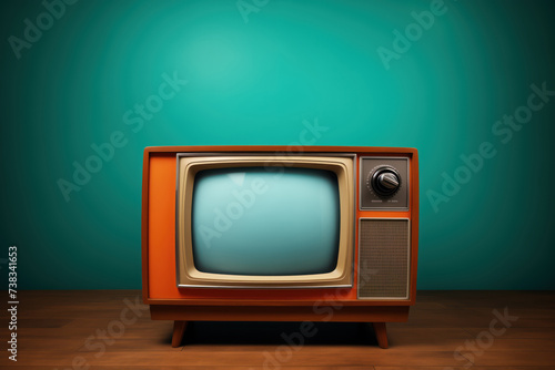 Retro style vintage orange television set on a wooden floor with a teal background wall.