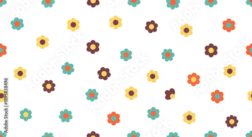 flower, floral, pattern, repeating, seamless pattern, scattered, simple, small, retro, stylised, bloom, colourful, yellow, teal, brown, orange, graphic, design, illustration, art, decorative, background, white, element, motif, nature, spring, summer, vintage, cheerful, clean, geometric, organic, surface, textile, wallpaper, fabric, print, modern, cute, object, icon, digital, creative, joyful