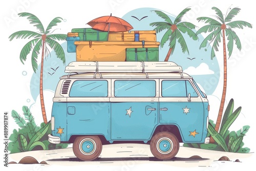retro, van, surfboard, palm tree, adventure, nostalgia, vibrant, artistic, setting, holiday, vacation, tropical, sun, beach, ocean, sea, leisure, bright, sun tanning, island, illustration, cartoon, fun, cheerful, sunlit, poolside, summer fun, resort, tropical beach, sunny day, colourful