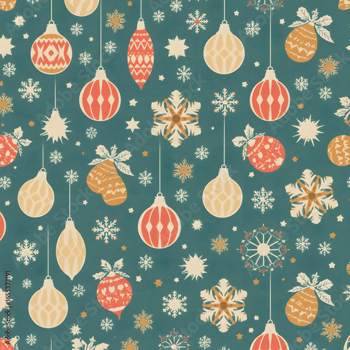christmas, seamless, pattern, retro, vintage, gift wrap, bauble, bell, star, snowflake, teal, mustard, coral, cream, nostalgic, festive, holiday, seasonal, cosy, merry, decorative, wrapping, paper, vector, illustration, design, repeatable, classic, playful