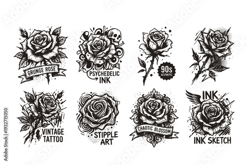 Retro Vintage Stipple Effect Rose Flower Grunge Collage Posters Surreal 90s Aesthetic Psychedelic Tattoo Art Halftone Grainy