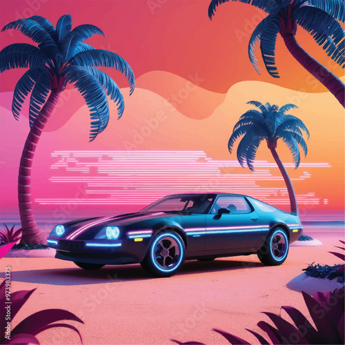 Retro wave background illustration in 80’s sci-fi style, car on a beach, 3d render, vector, illustration