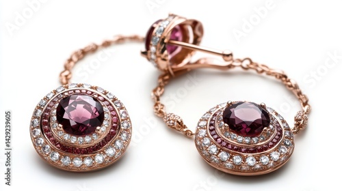 rose, gold, jewellery, set, ruby, diamond, accent, earring, necklace, ring, isolate, white, background