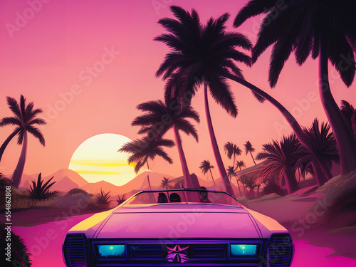 Retrowave car on a palms road near the sea on a sunset, Generative AI