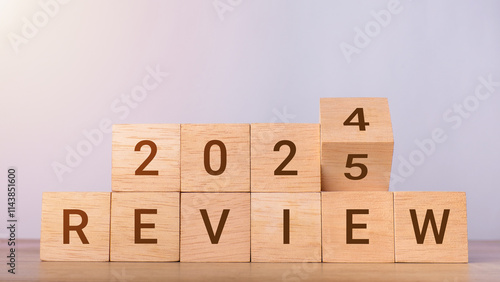 Review 2025. Flips wooden cube and changes words Review 2024 to Review 2025. Business growth, goals, planning. Business Review 2025 New Year concept