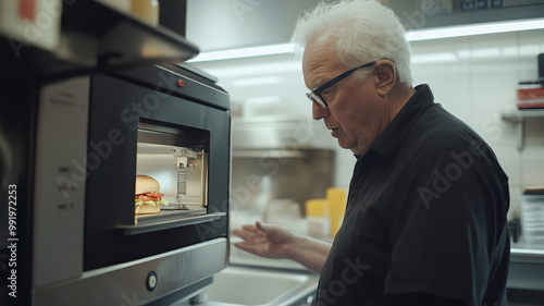 Revolutionizing cooking as an older chef watches a food printer create a gourmet burger in a sleek modern kitchen setting