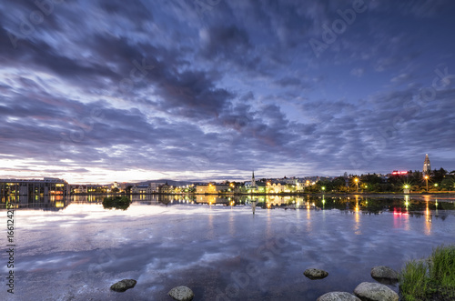 reykjavik, iceland, city, skyline, summer, twilight, night, evening, sunset, duck pond, city hall, church, hallgrimskirkja, sky, dramatic, cloudscape, city landscape, midnight sun