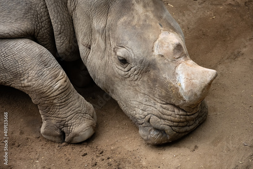 rhinocero lie down on the ground in a zoo