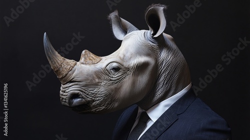 Rhinoceros Head in an Elegant Business Suit on a Black Background, Conceptual Wildlife Portrait