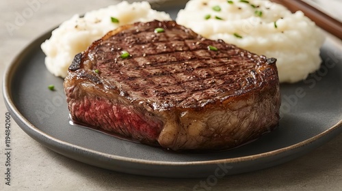 Ribeye steak cooked to perfection, served on a plate with a side of garlic mashed potatoes