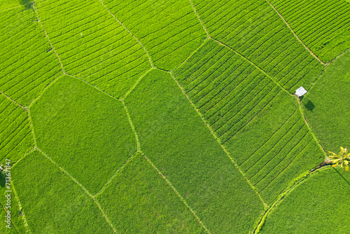 Rice field aerial Shot at east of Indonesia. Rice field at Sumbawa village, Aerial agriculture in rice fields