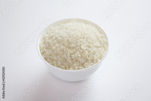 rice grains in a bowl isolated on white background.