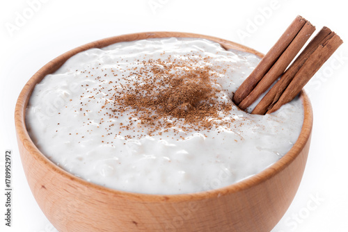 bowl, breakfast, cinnamon, closeup, creamy, dairy, dessert, food, homemade, isolated, milk, minimal, natural light, rice, simple, snack, sweet, traditional, white, white background, wooden bowl