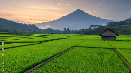 rice, sunrise, tranquil, serene, gold, light, grass, field, travel, meadow, countryside, summer, cloud, hill, traditional, beauty, greenery, terraced, sky, mount, spring, volcano, peak, lush, green, field, hut, tropical, palm, tree, mist, vale, pace, landscape, idylli, morning, vibrant, photorealistic, peaceful, dawn, scenic, nature, farm, agriculture, harvest, glow, natural, sunlight