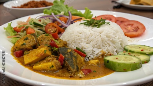 food, meal, dish, dinner, meat, rice, chicken, vegetable, plate, cookery, pork meat, salad, pepper, fried, delicious, tomatoes, epicure, healthy, lunch, fish, green, shrimp, thai, eatery, fresh