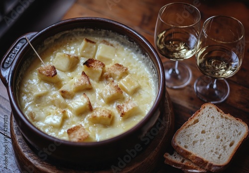 Rich and Creamy Cheese Fondue with Crusty Bread and White Wine Served in a Rustic Pot with Toasted Bread on a Wooden Table