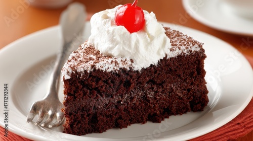 Rich and Decadent Chocolate Cake Slice Topped with Whipped Cream and Cherry on a Plate with Silver Fork