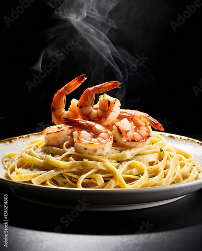 Rich and savory fettuccine pasta with shrimp or prawns on a plate just cooked from the kitchen food photography wallpaper stock photo for menu