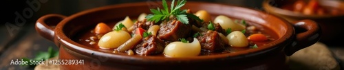 Rich beef stew with onions and mushrooms in a large earthenware pot, rustic dishes, pots
