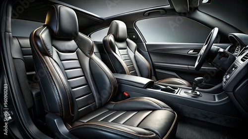 rich black smooth leather texture on sleek sports car seats with chrome accents and subtle stitching in high-contrast dramatic low-key lighting
