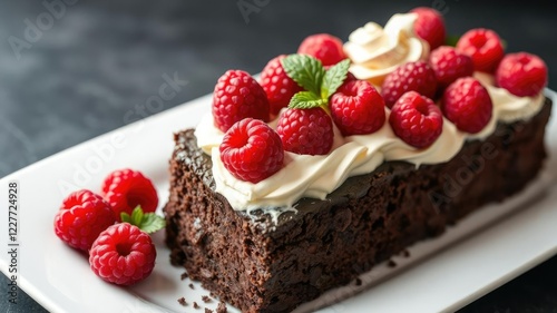 Rich chocolate cake topped with a generous helping of fresh raspberries and cream cheese frosting, sweet treats, culinary art