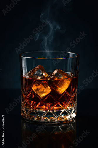 liquid, colours, depth, drink, beverage, alcohol, refreshment, coolness, coldness, celebration, spirit, toast, night, pour, serve, chill, refresh, classic, faceted, crystal, whiskey, tumbler, glasses, amber, gloss, ice, cube, smoke, vapour, bar, adult, shiny, clear, cool, elegant, rich, moody, dark, cold, transparent