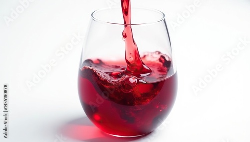 Rich red wine poured into a glass, clean white backdrop, crimson, alcohol drink