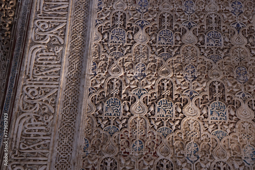 Richly detailed Arabic style wall decorations in the Royal Nazaries Palace in Alhambra, Granada, Andalusia, Spain