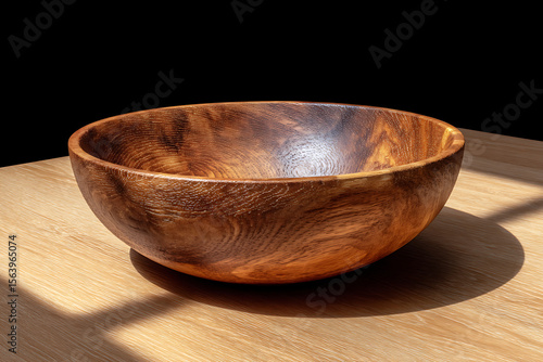 wooden bowl, handcraft, grain, texture, brown, warm tones, sunlight, shadow, tabletop, dark background, empty, serving, decorative, kitchen utensile, rustic, organic, polished, smooth, simple, elegant, home decor, studio shot, object, interior, still life
