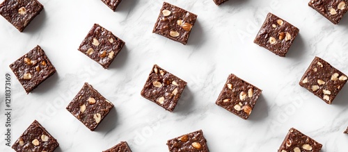 Richly textured brownies with nuts arranged in a grid pattern on a white marble background showcasing their enticing presentation and cocoa flavor.