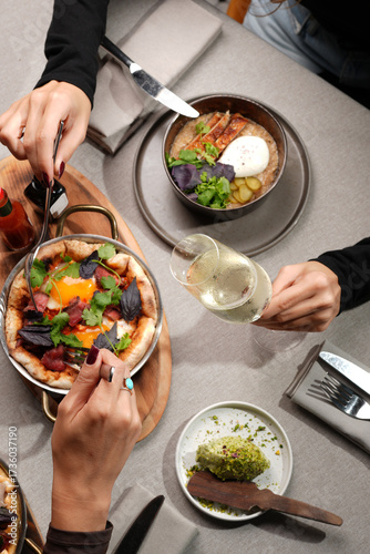 toasting, brunch, wine, epicure, food, overhead, frying pan, porridge, dining, celebration, friends, poached, egg, friendship, people, photo, togetherness, enjoyment, drink, eatery, wine glass, woman, table, lunch, cafes, joy, hand, success, plate, vertical, holding