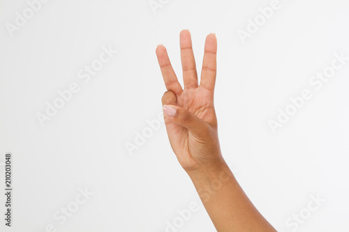 right hand a black woman show the third, number three sign. isolated on white background. afro american hand. Mock up. Copy space. Template. Blank.
