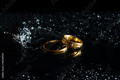 Rings on a dark background. Wedding rings. Jewelry. Splashes of water.