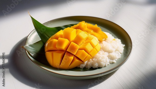 Ripe mango and sticky rice on wooden table