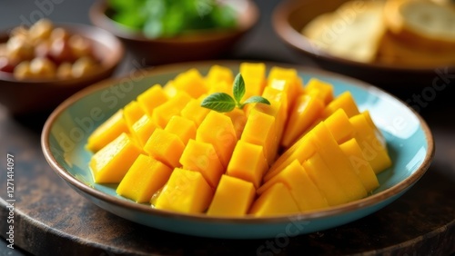 Ripe mango cut into cubes and served on a plate, ready to be enjoyed.Freshly cut mango slices decorated with mint on a plate