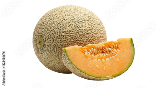 Ripe Melon Slice: A close-up view of a whole cantaloupe with a succulent slice, showcasing the vibrant orange flesh and refreshing appeal.