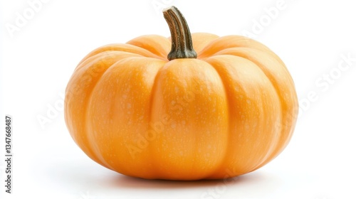 Ripe orange pumpkin featuring textured surface and strong stem resting against crisp white background, representing seasonal autumn harvest