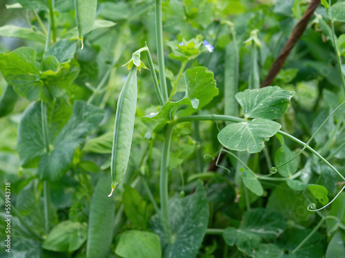Ripe pods of green pea growing on farm. Bush with bunch of pods of mangetout plant (Pisum sativum) ripening in homemade garden. Organic farming, healthy food, BIO viands, back to nature concept.