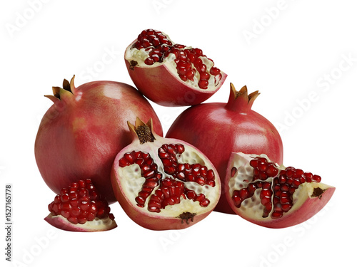 Ripe pomegranates, some halved, isolated on transparent background