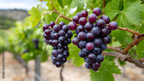 Ripe purple grape clusters hanging on the vine in a vineyard.