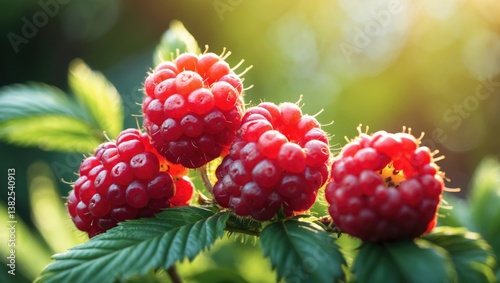 Ripe raspberries growing on a bush in the garden.